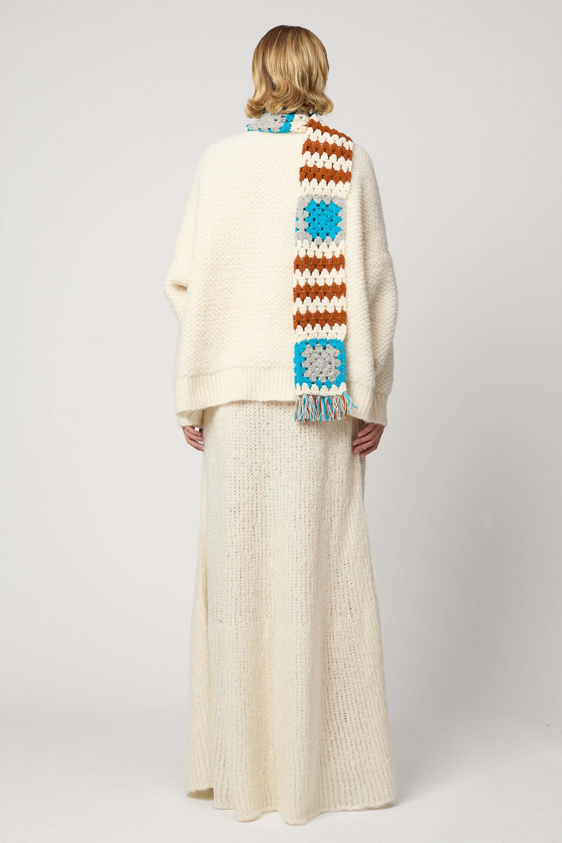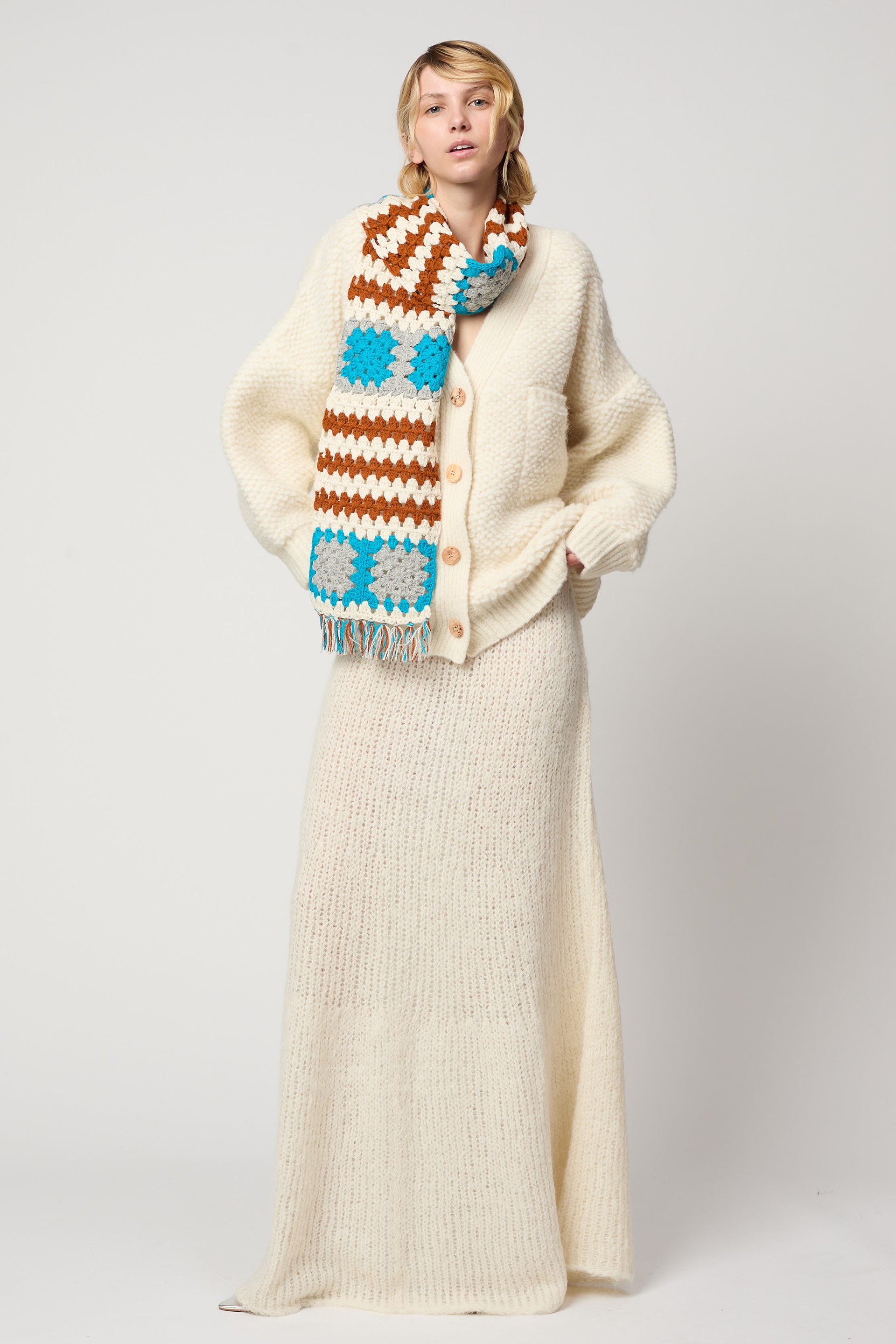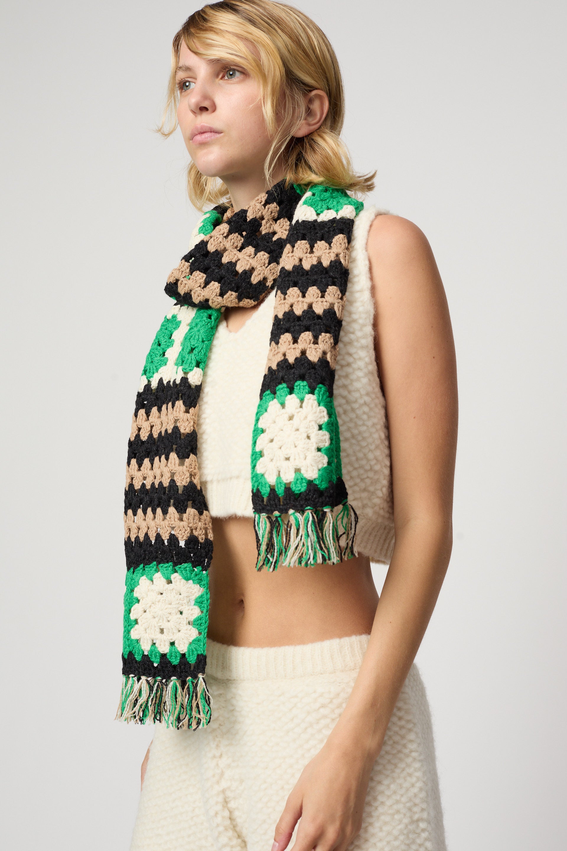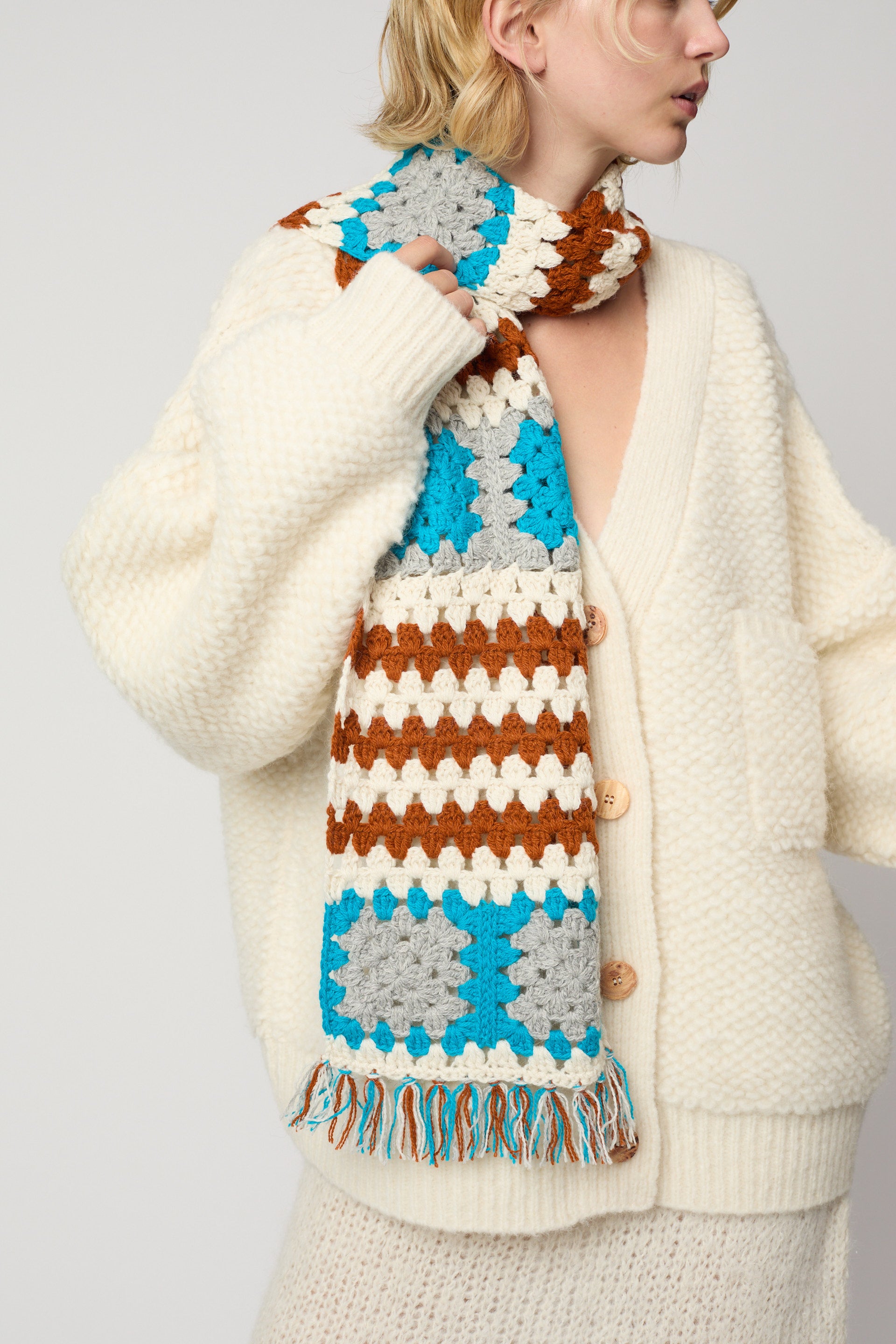 意外な色の組み合わせがモダンな家宝のような雰囲気を醸し出すパッチワーク クロシェ スカーフ。より落ち着いたアトリエ デルフィンのルックと組み合わせると、寒い季節にぴったりです。オープン パッチワーク構造が、重ね着に巧みな奥行きを与えます。冬のホリデー ギフトに最適です。