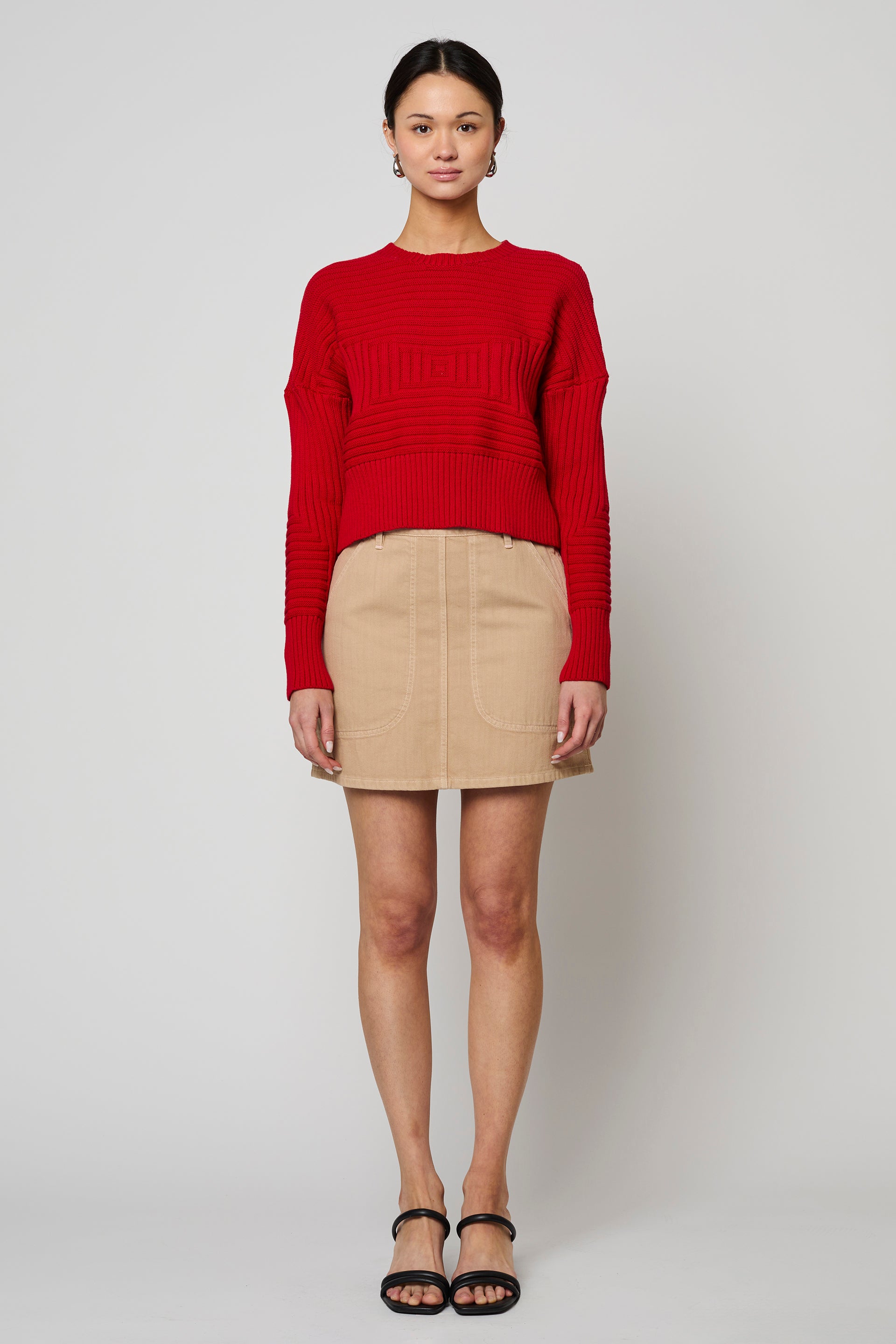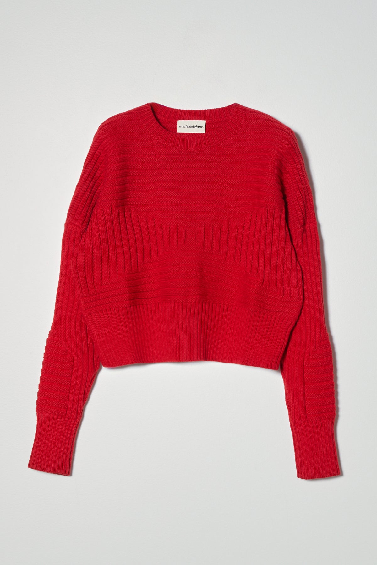 The Slouchy Sweater offers a sculptural take on cozy layering, balancing softness with structure. Geometric ribbing is thoughtfully placed to create subtle dimension and an artful piece. With a cropped length and intentionally shaped armholes that hold form rather than drape, this piece brings a quiet boldness to the collection. A soft, tactile feel grounds its modern shape in comfort.
