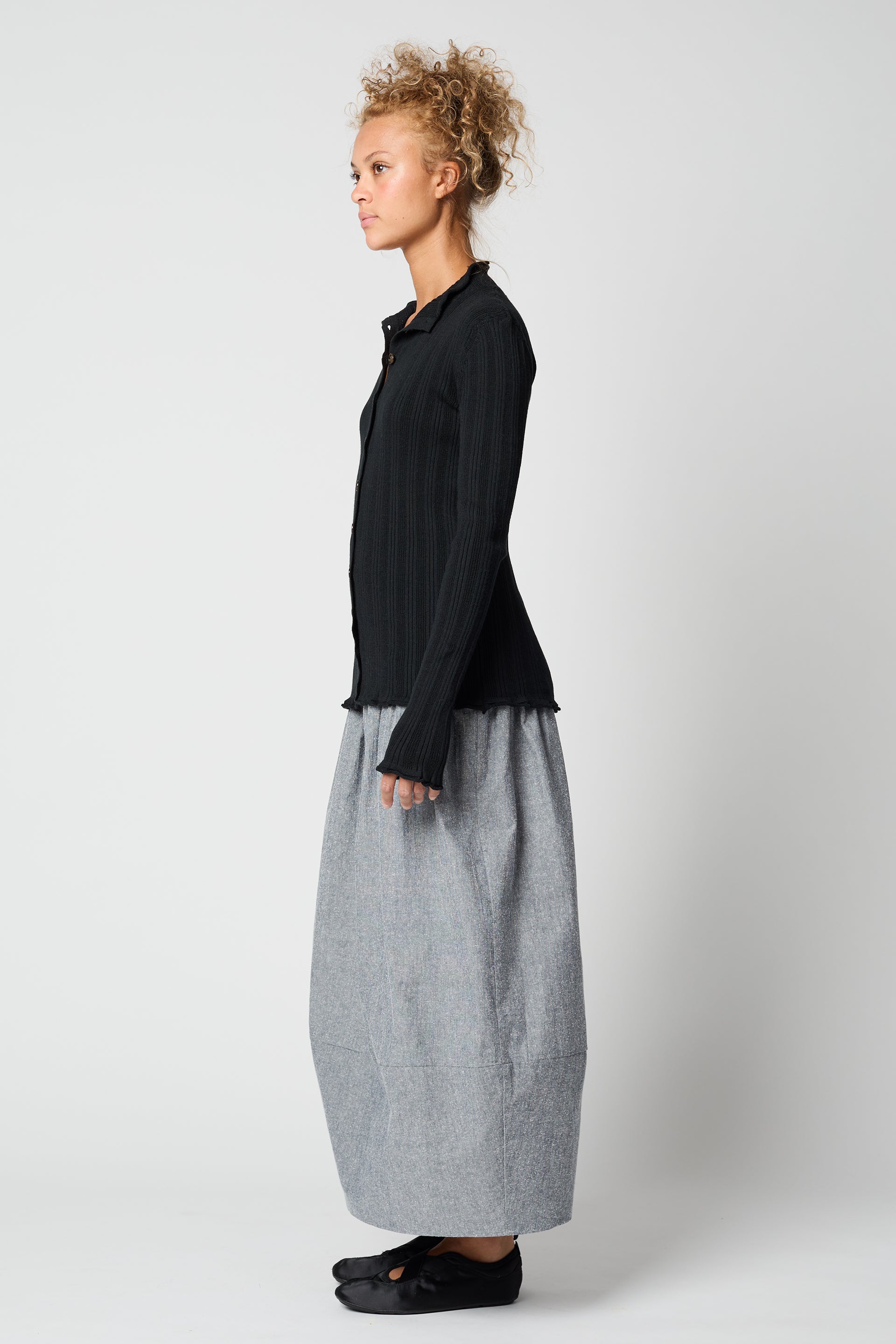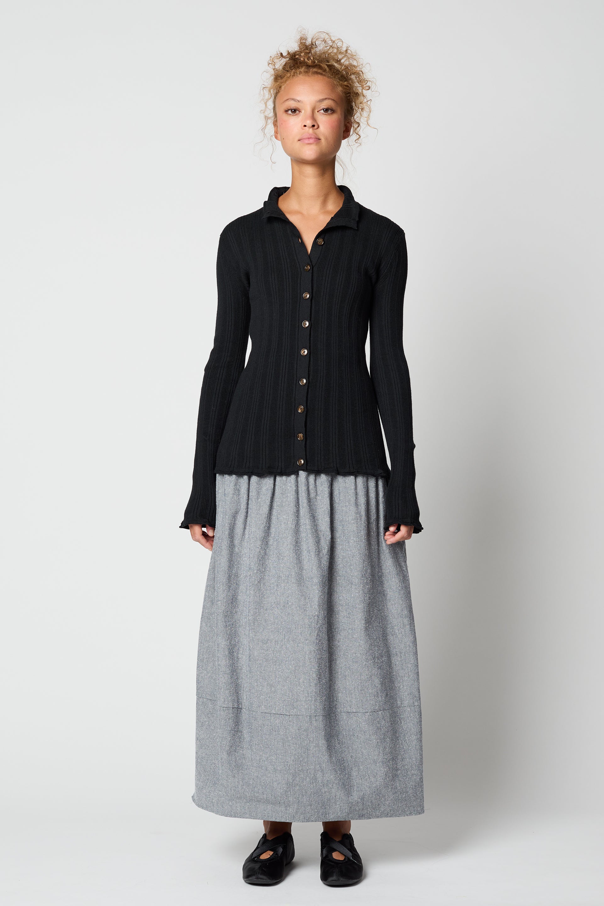 Slim pointelle knit cardigan with collar detail. Can be worn buttoned up or opened up in a spread collar. A sharply versatile knit to take you through the seasons.