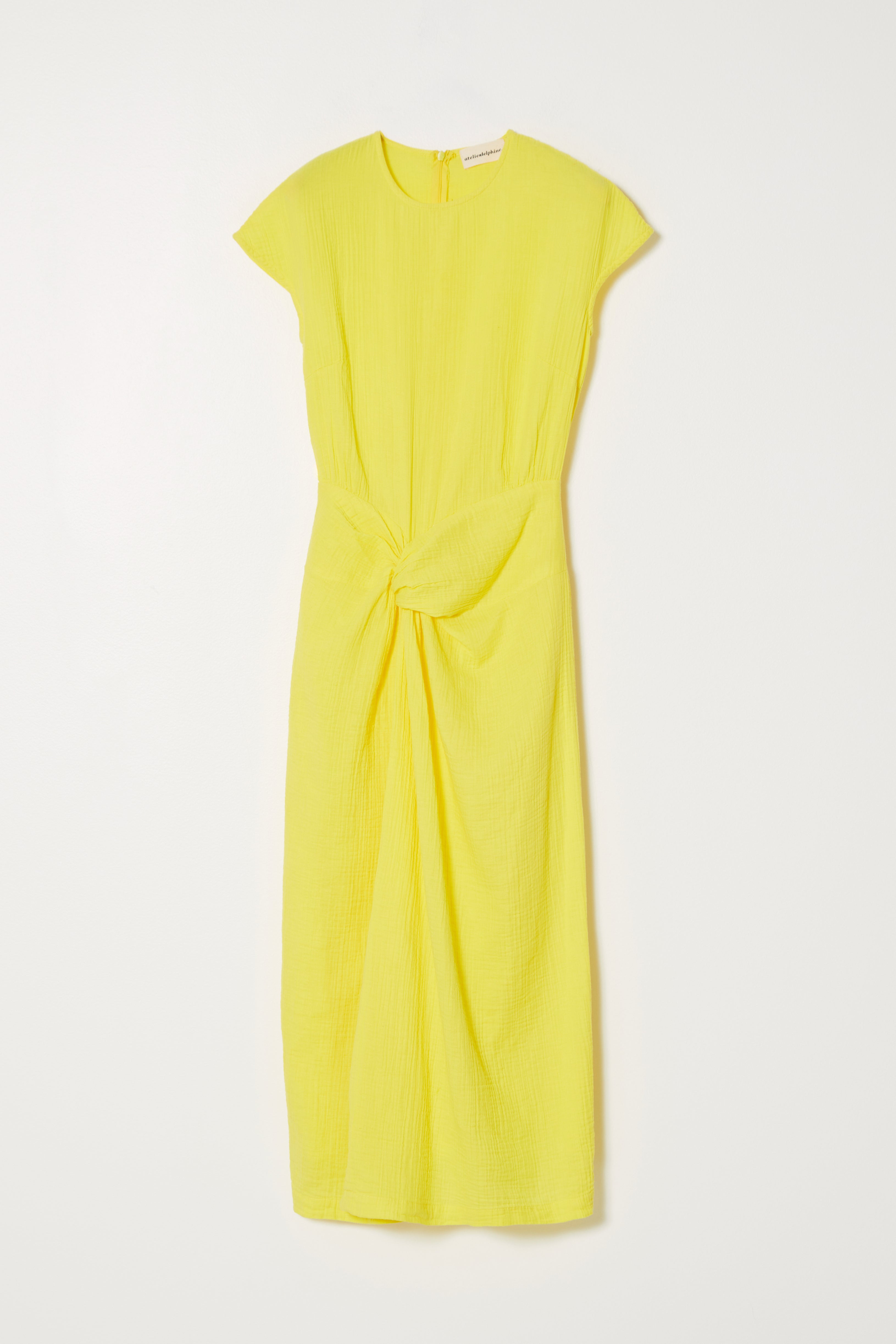 A soft, sculptural silhouette with effortless drape. The Sartre Dress features a relaxed fit with subtle volume, balanced by refined detailing. Tailored midi dress in our crinkled cotton gauze with a draped knot detail at the waist. It falls into a relaxed fit with a playful slit at the front hem for ease of movement. An essential for everyday ease.
