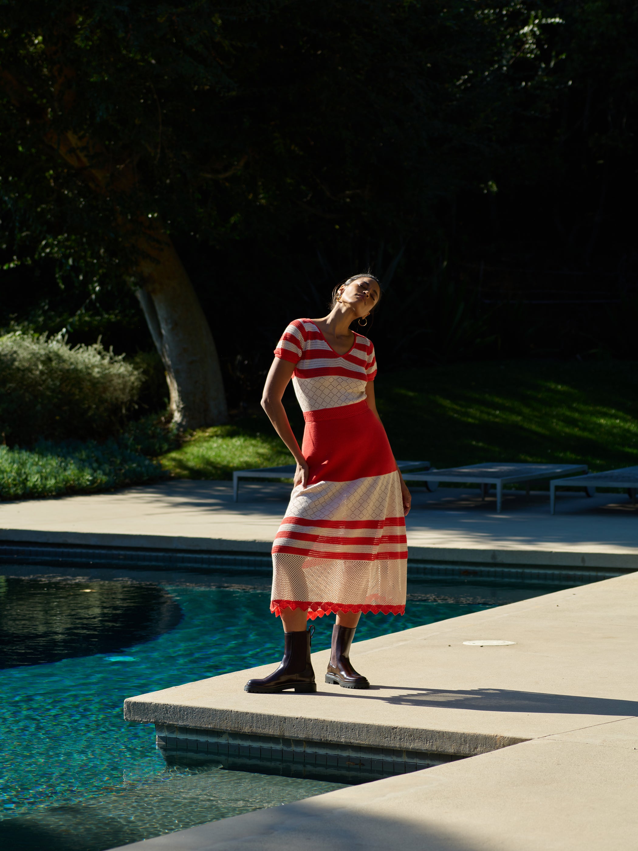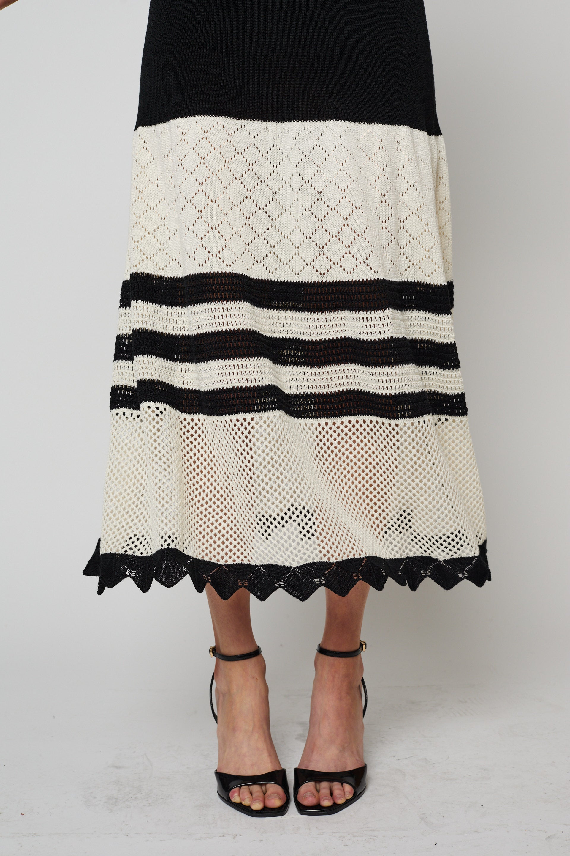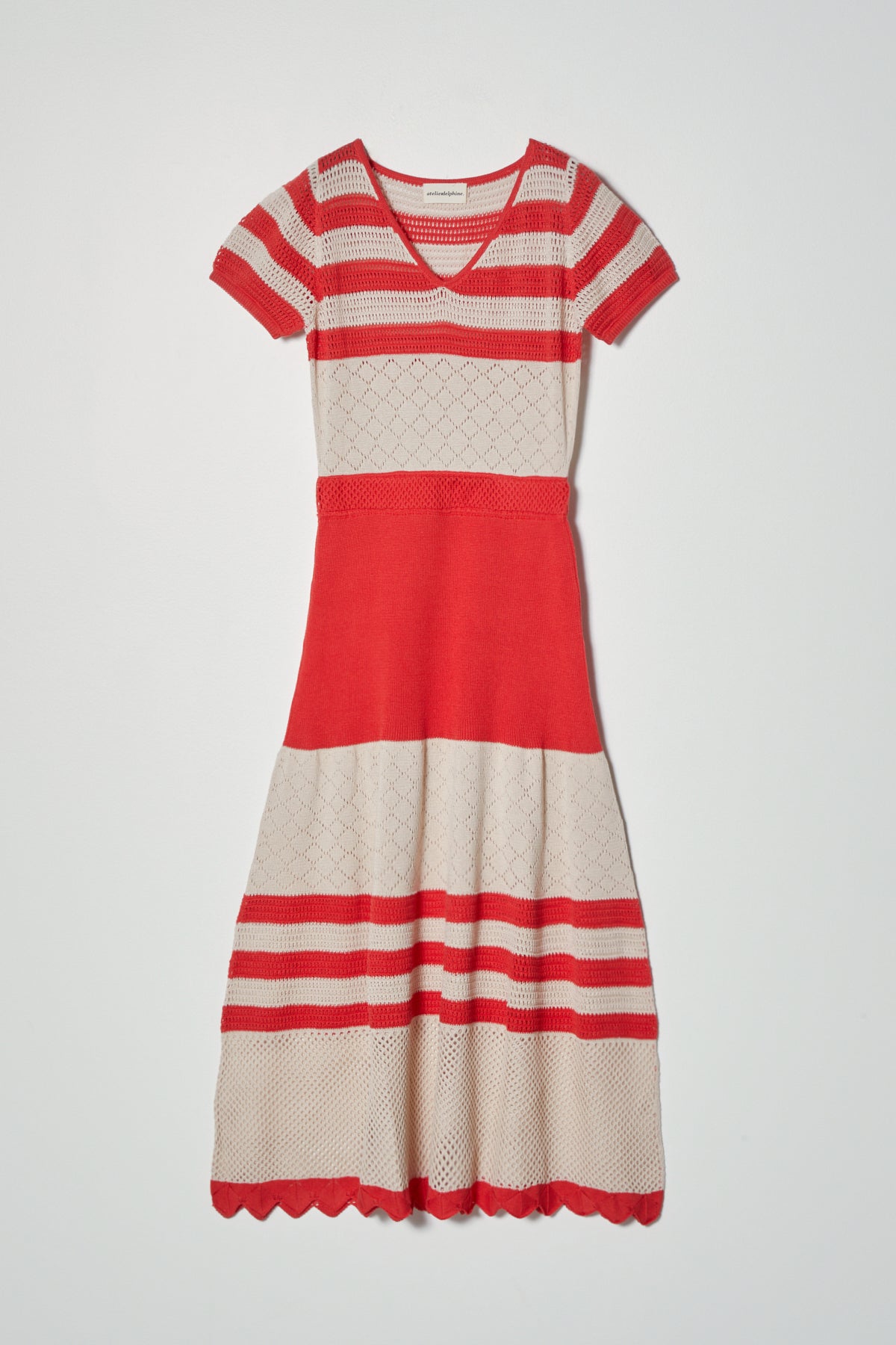 The Sydney Dress is all about texture and flow. A deep V neckline and tubular knit finish give it a clean, secure fit through the chest, while a soft elastic waistband brings shape to the waist. From top to bottom, mixed knit techniques—openwork, diamond knits, stretchy rib, and airy fishnet—create movement and depth. The skirt falls to a maxi length with a vintage-inspired triangle hem that feels both relaxed and refined.