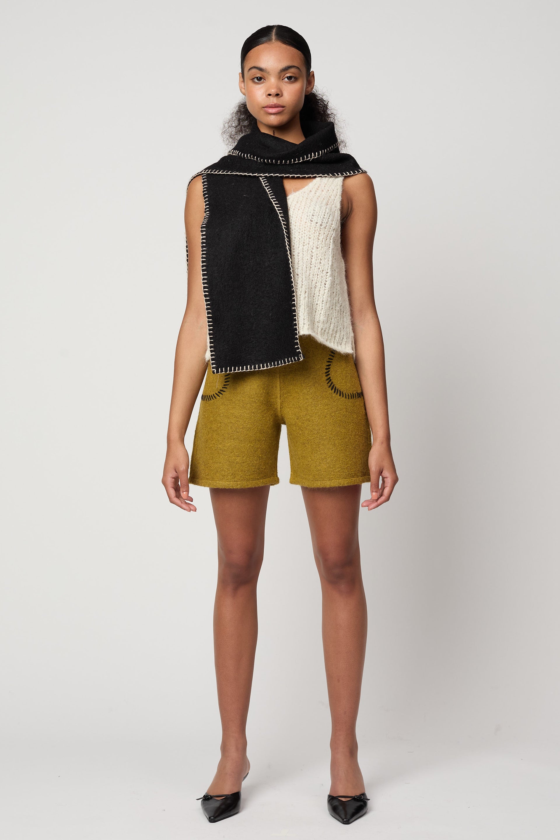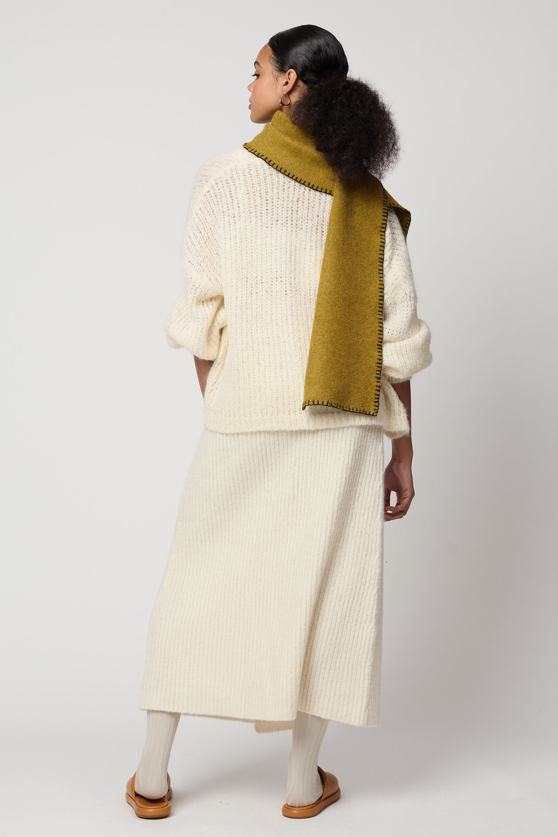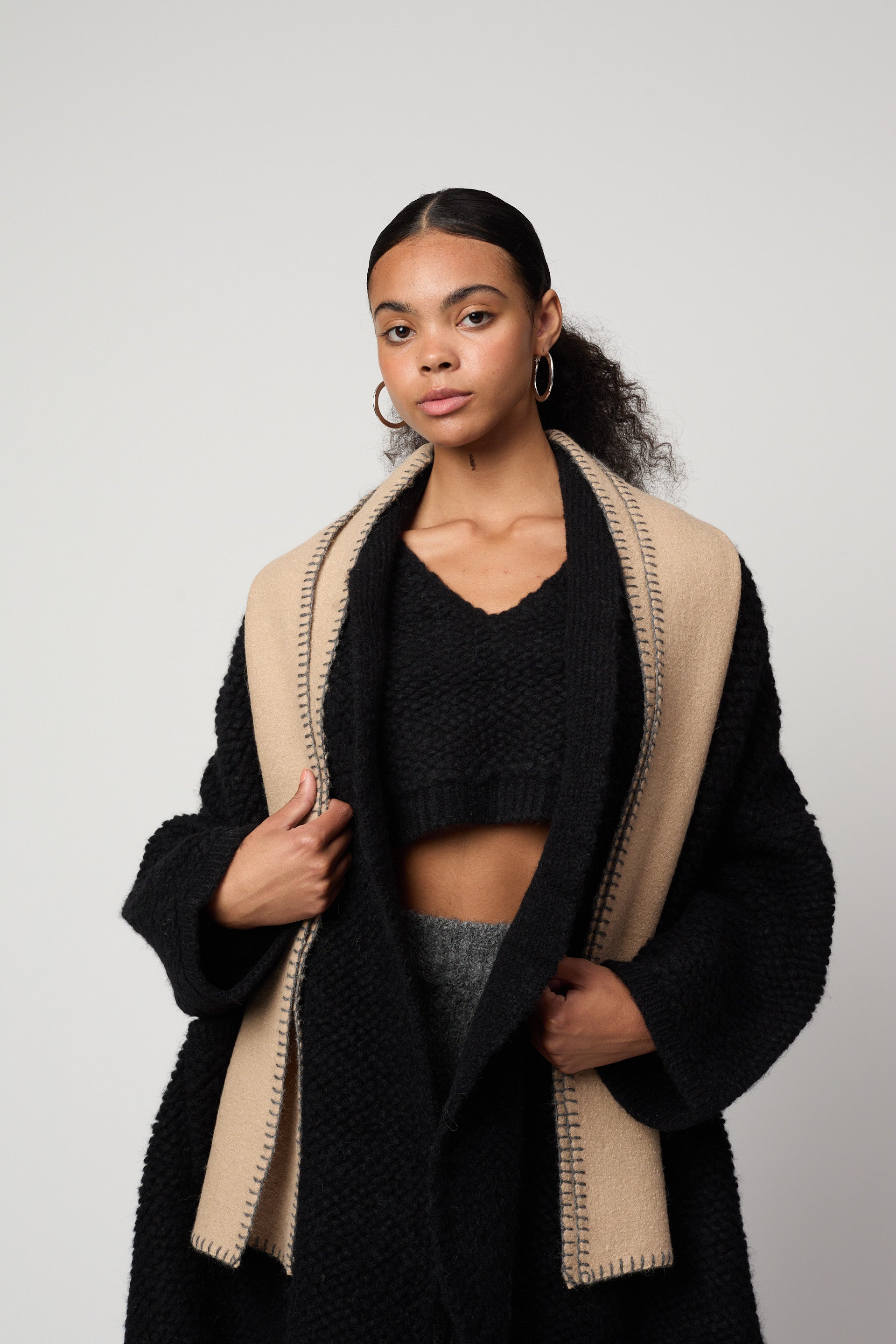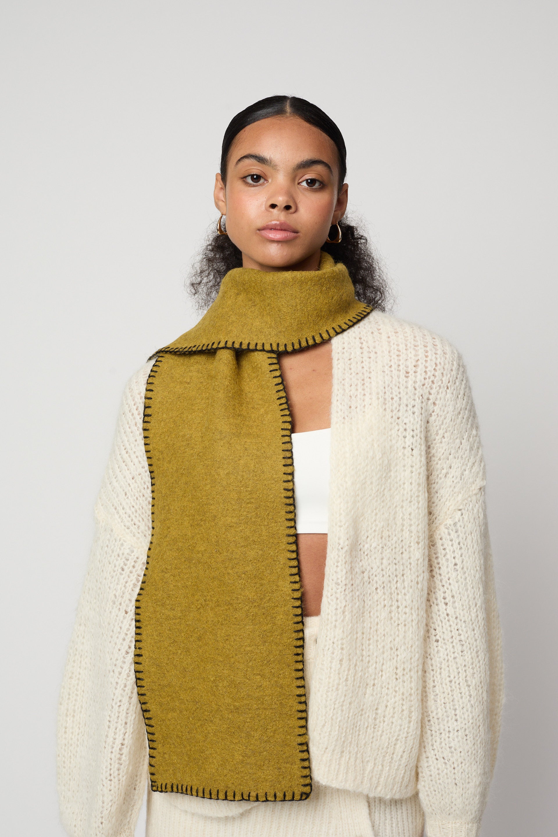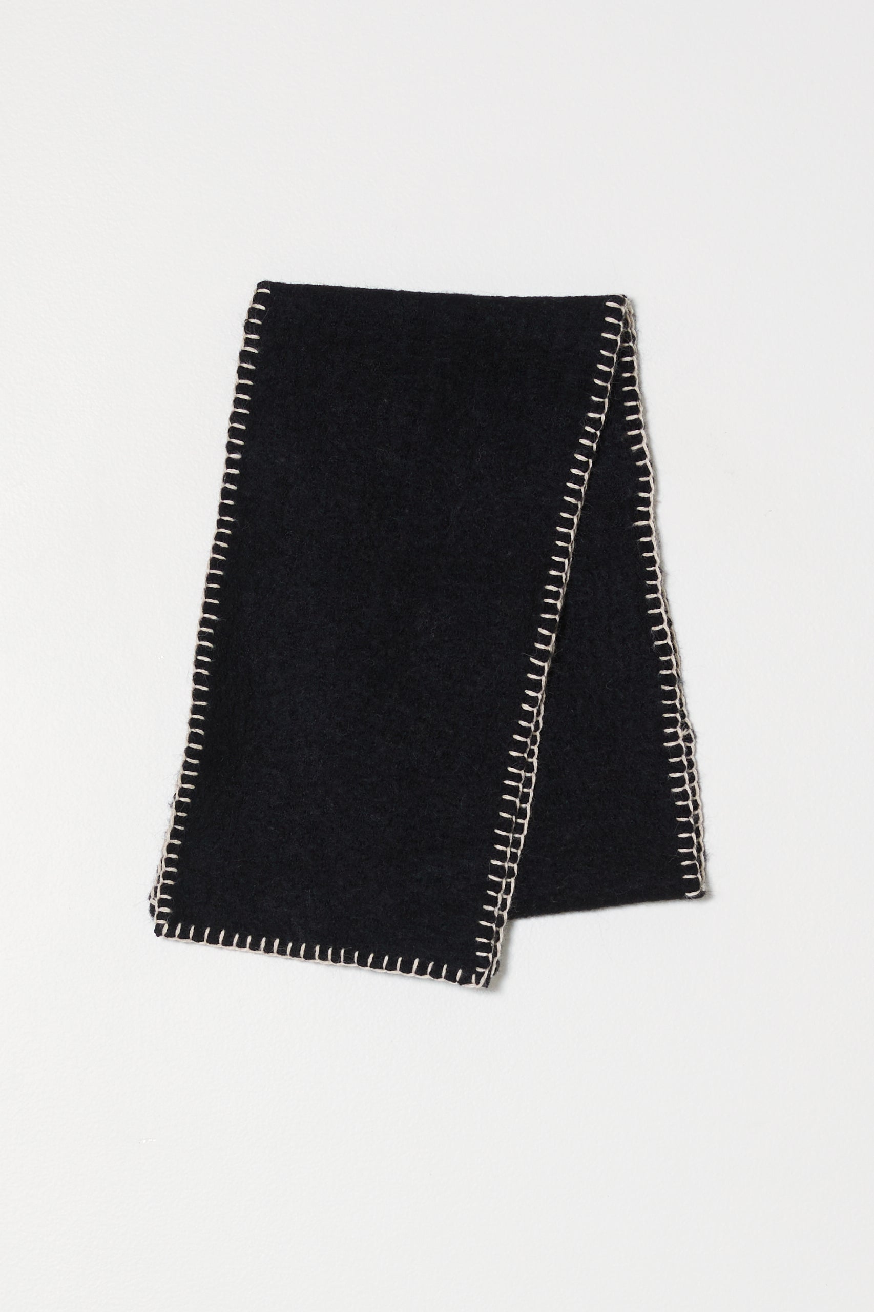 Lightly felted scarf in our baby alpaca blend with contrasting whipstitch trim. Features a clean, luxurious hand with handwork trim detailing. Wear back to your Atelier Delphine knitwear for an elegant, cozy pop.